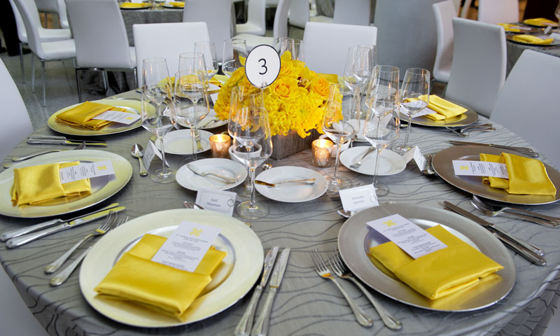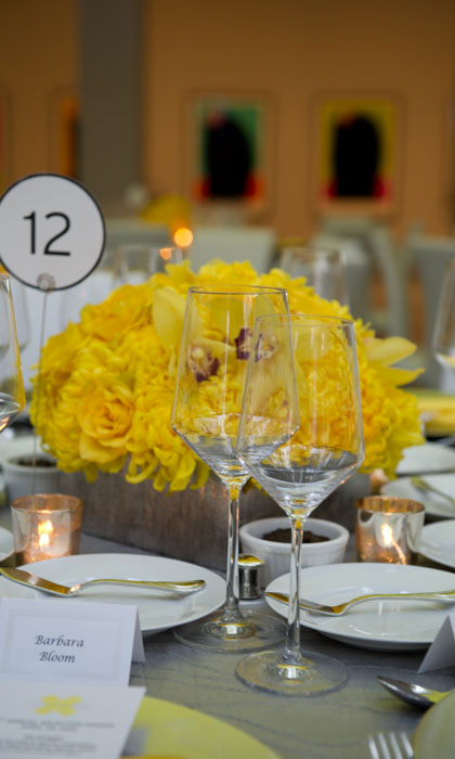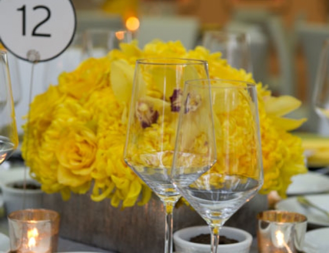 What an honor to have asked to help design this event for their patrons. This incredible venue - The Museum of Contemporary Art La Jolla was the perfect place to showcase these low arrangements in yellow spider mum and roses arranged in a square platinum container.