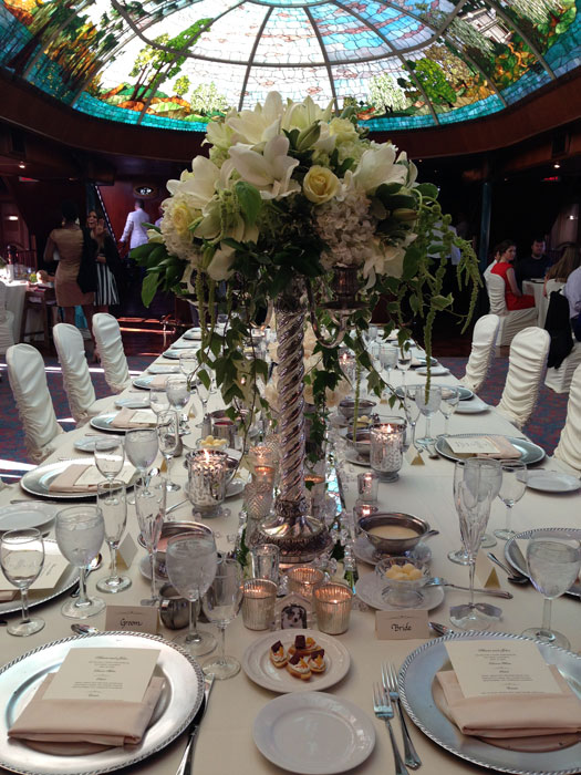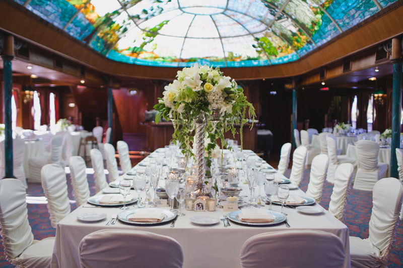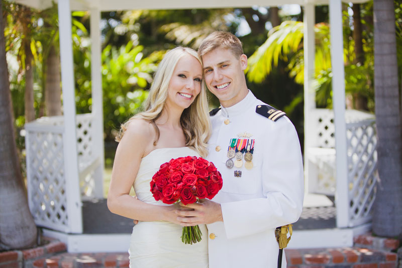 A romantic blend of red roses and tall beautiful white and green centerpieces were used for this wedding on board one of San Diego's most famous boats. What a beautiful couple and a perfect backdrop for a military wedding. Photographs courtesy of brettandemilyphoto.com