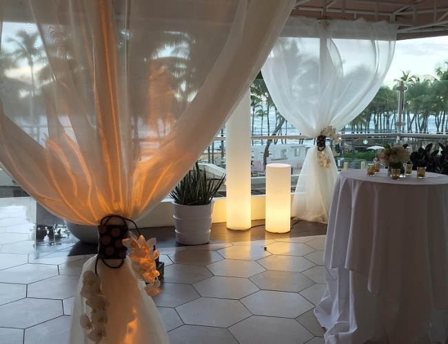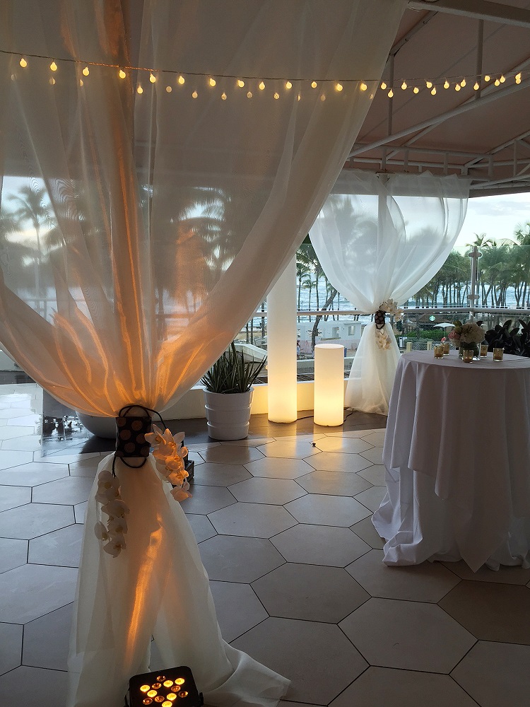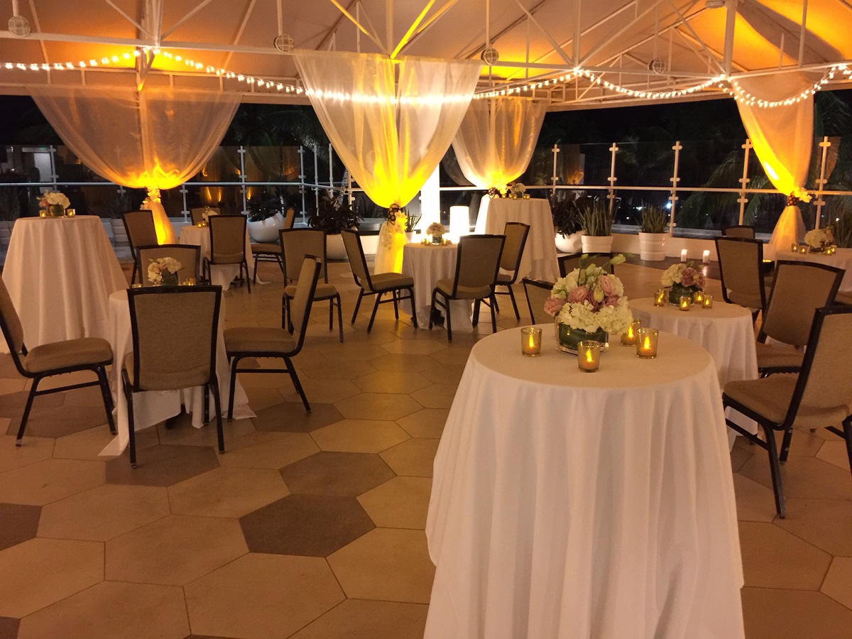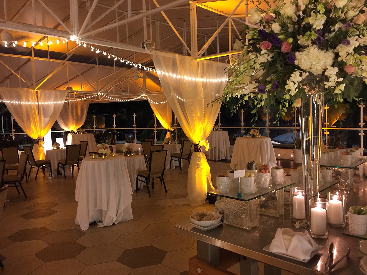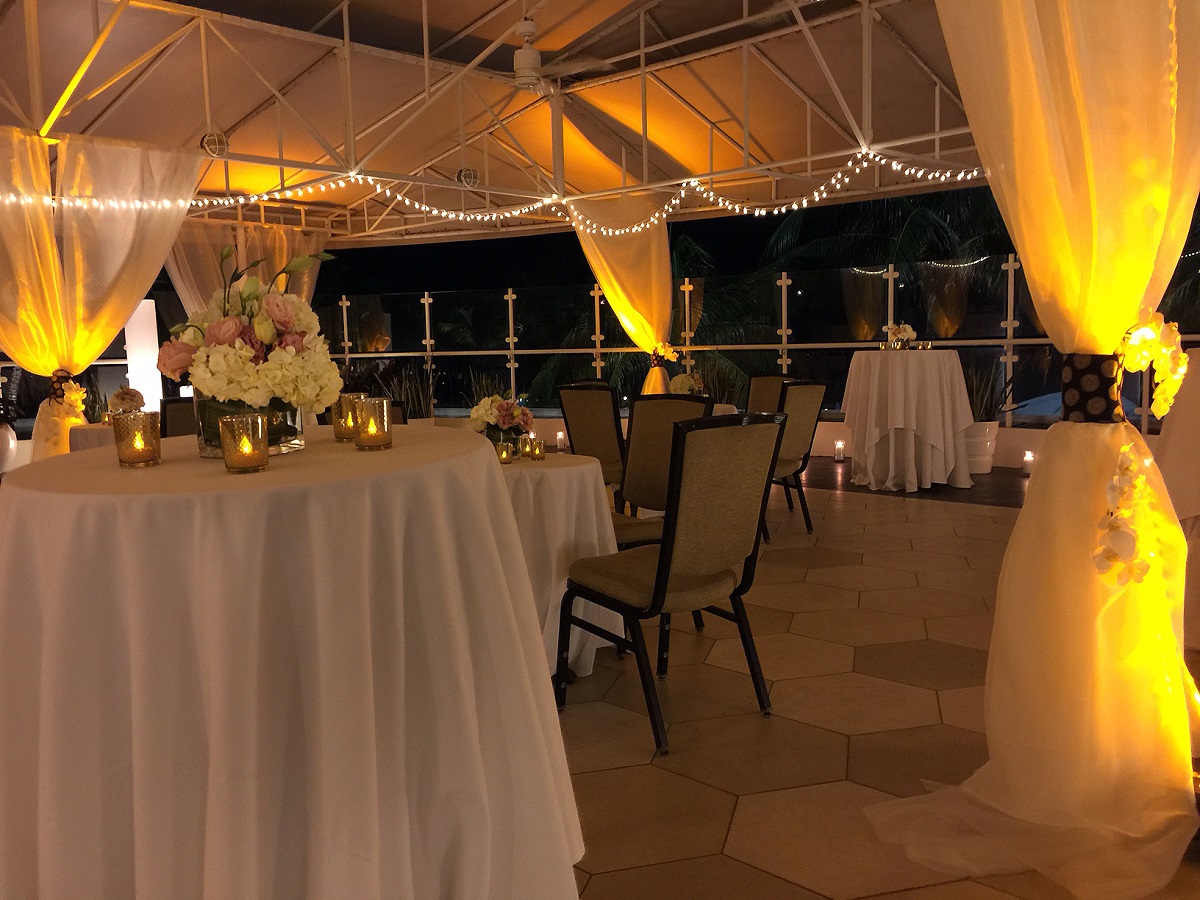 The challenge was to create a fun space for 125 invited guests to begin celebrating the wedding of Denis & Bryan. The Hilton Caribe provided the perfect backdrop for their rehearsal cocktail party. We were presented with an open-air room that overlooked the hotel grounds and the blue waters of the Caribbean. After adding flowing drapes, hundreds of candles, specialty market lights and florals the room glowed & wowed each guest as they arrived. The best expression was on the face of Denise when she walked into the room with her fiance Bryan.