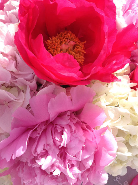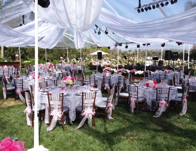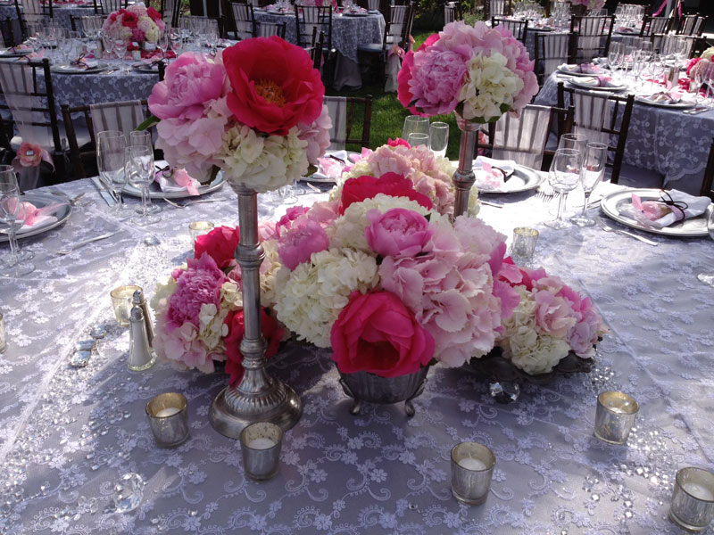 During the summer months we see a lot of weddings turn to the the beauty of the outdoors. What can be more perfect than the use of Peonies, roses and hydrangea on these tables - all centered under a clear pavilion.
