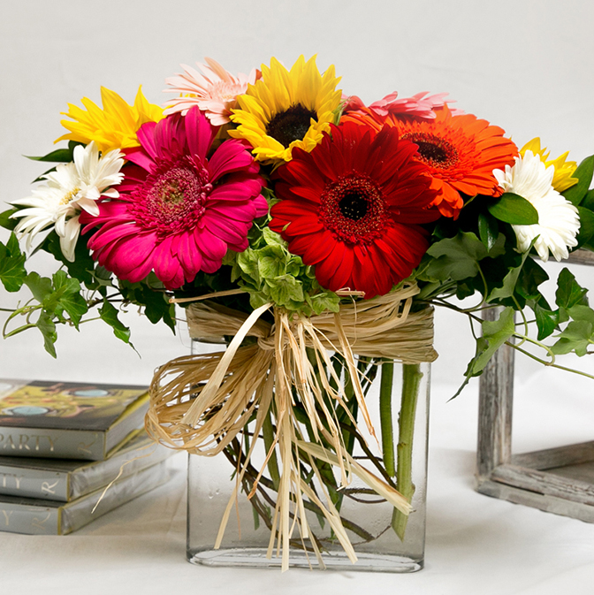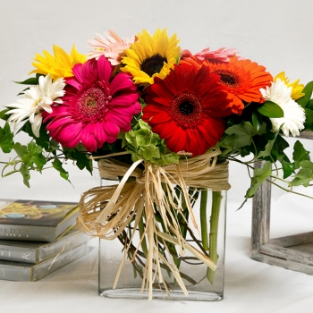 Need to cheer someone up or just send some sunshine to someone you love? This is the perfect arrangement to make anyone smile. An envelope vase is filled with hydrangea, gerberas and sunflowers - all tied with a raffia bow. Note: 20% of the proceeds from this arrangement go to benefit Promises2Kids. Creating a brighter future for foster children. For more information on this organization - go to - www.promises2kids.org