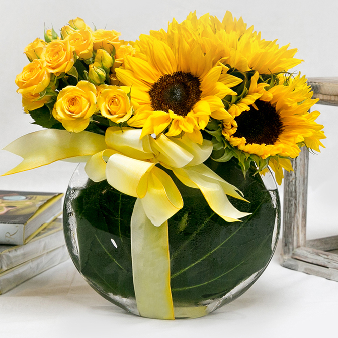 This mix of yellow spray roses and sunflowers is arranged in a glass vase and lined with ti-leaves and tied-up with a yellow bow. Perfect for any occasion when you want to send a little Sunshine.
